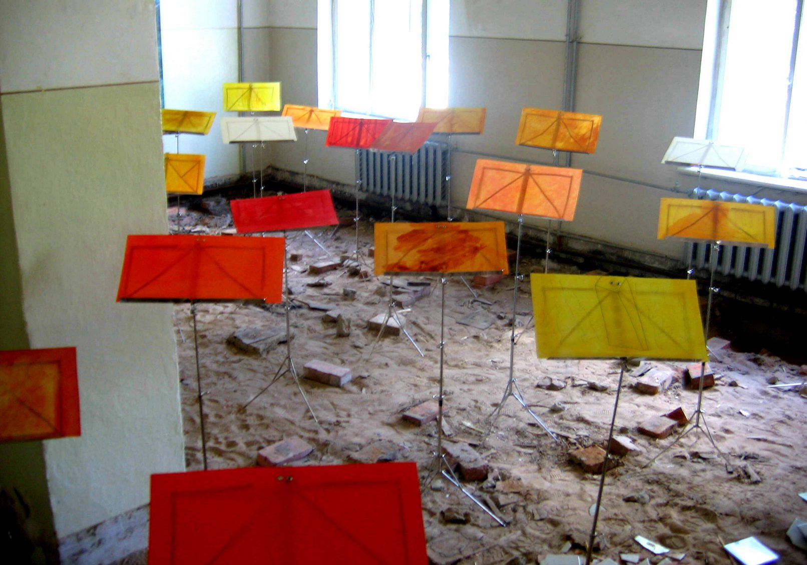 Valmiera, Lettland, 2005 Rauminstallation 3 Räume 42 Notenständer, 35 Zeichnungen, 60 x 30 Bleistift, Öl auf Papier