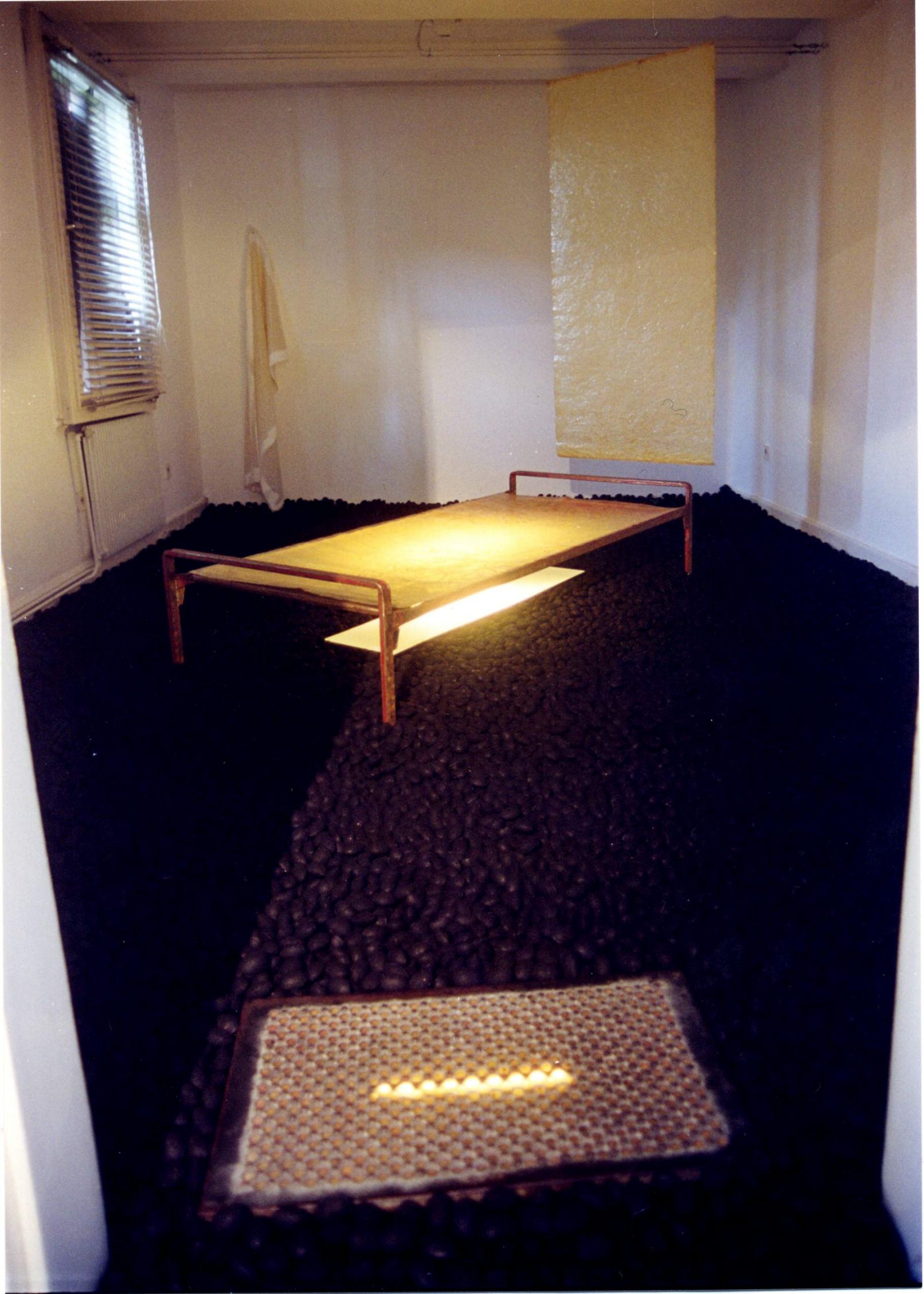 Installation mit Holzkohle und in Öl getränkten Papieren